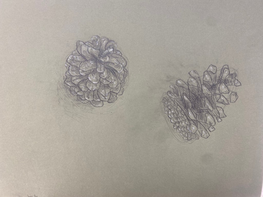 I’m quite comfortable with hatching and crosshatching, in other personal works I use it frequently, but pine ones are hard and have to many petals and details that made me crash out, I am proud of this (even though it’s small way to small on paper) I think I did well on this project.